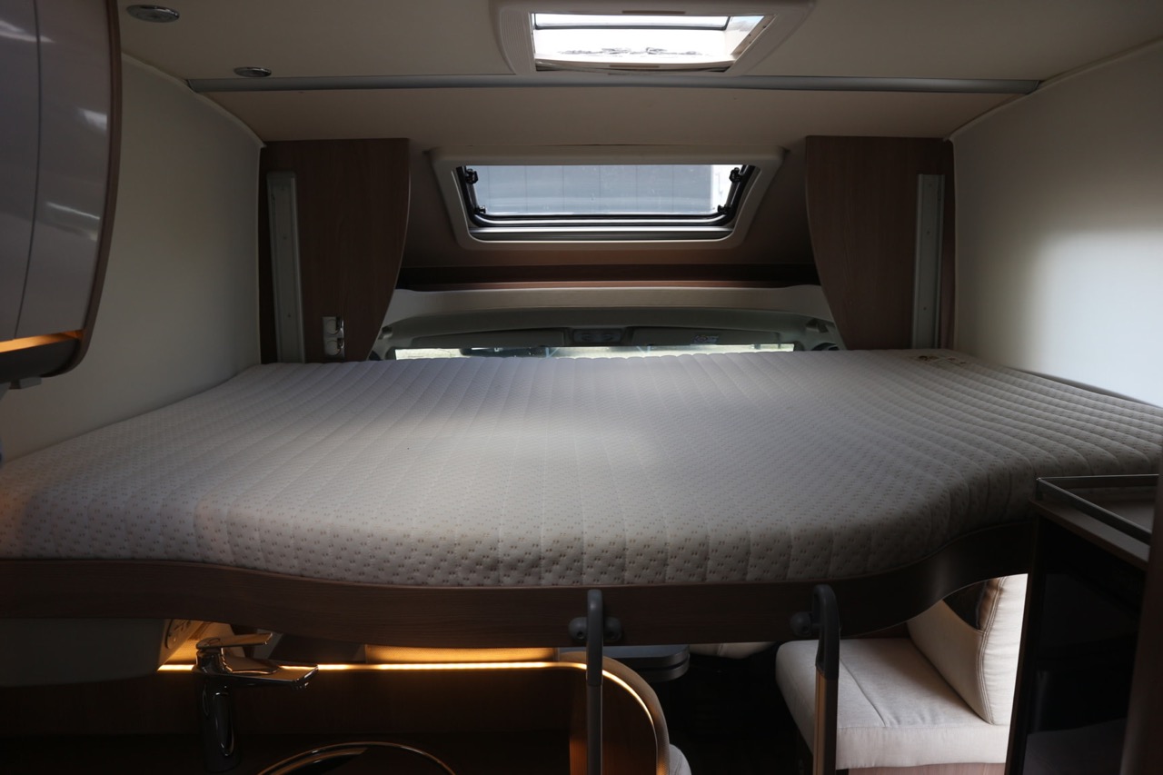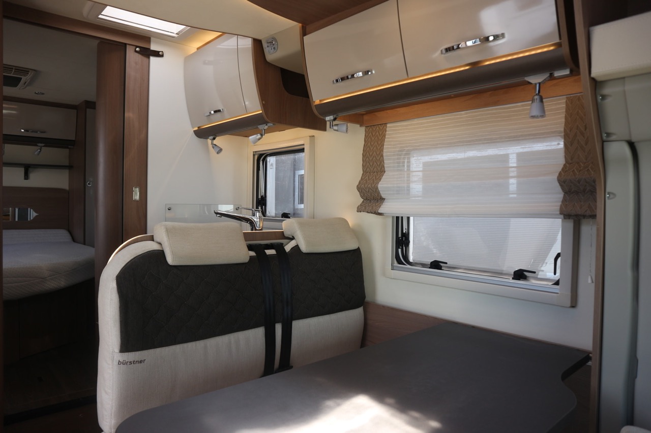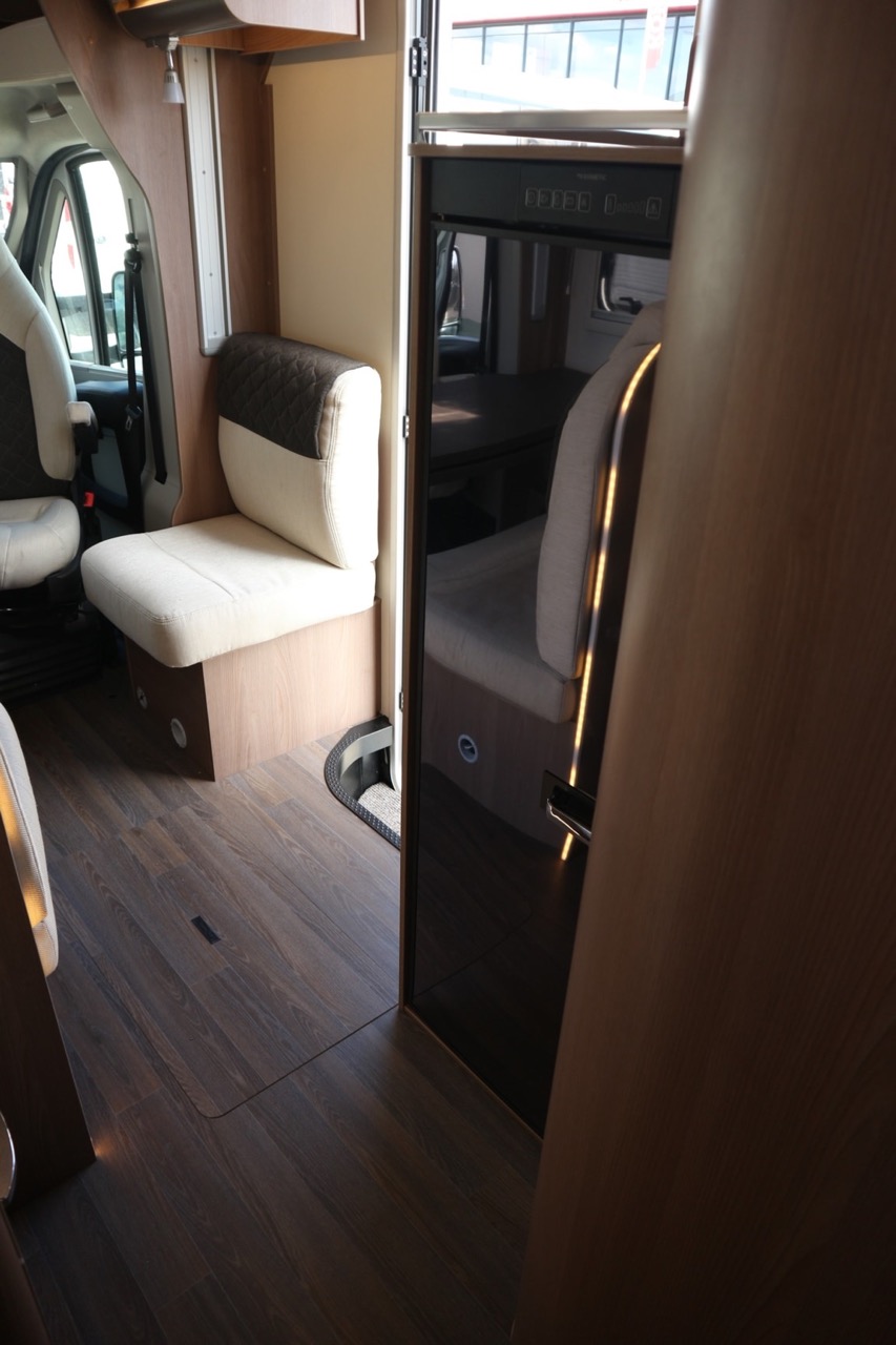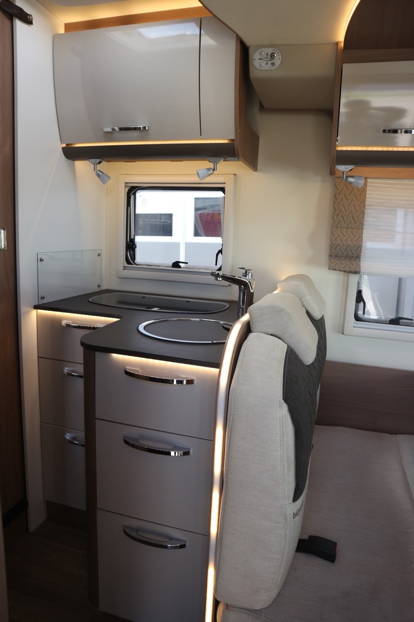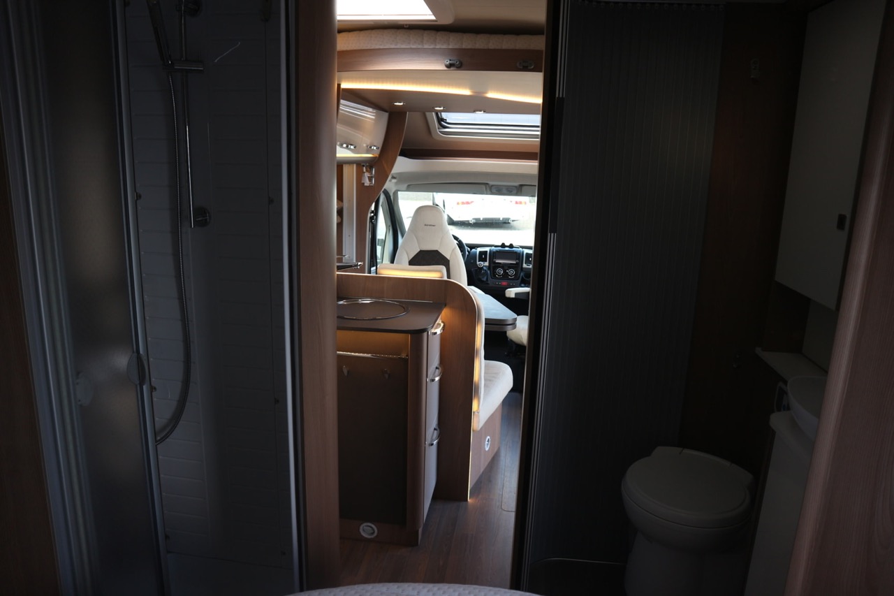 Een prima gelegenheid om gezellig te eten of nieuwe plannen te maken wordt gevormd door de halve treinzit. De keuken is in het midden van de camper gemonteerd en beschikt onder meer over een 3-pits kooktoestel en gootsteen met kraan. De boiler, die in de camper is ingebouwd, voorziet u snel van warm water. De koelkast met vriesvak biedt voldoende ruimte voor heel uw voorraad.