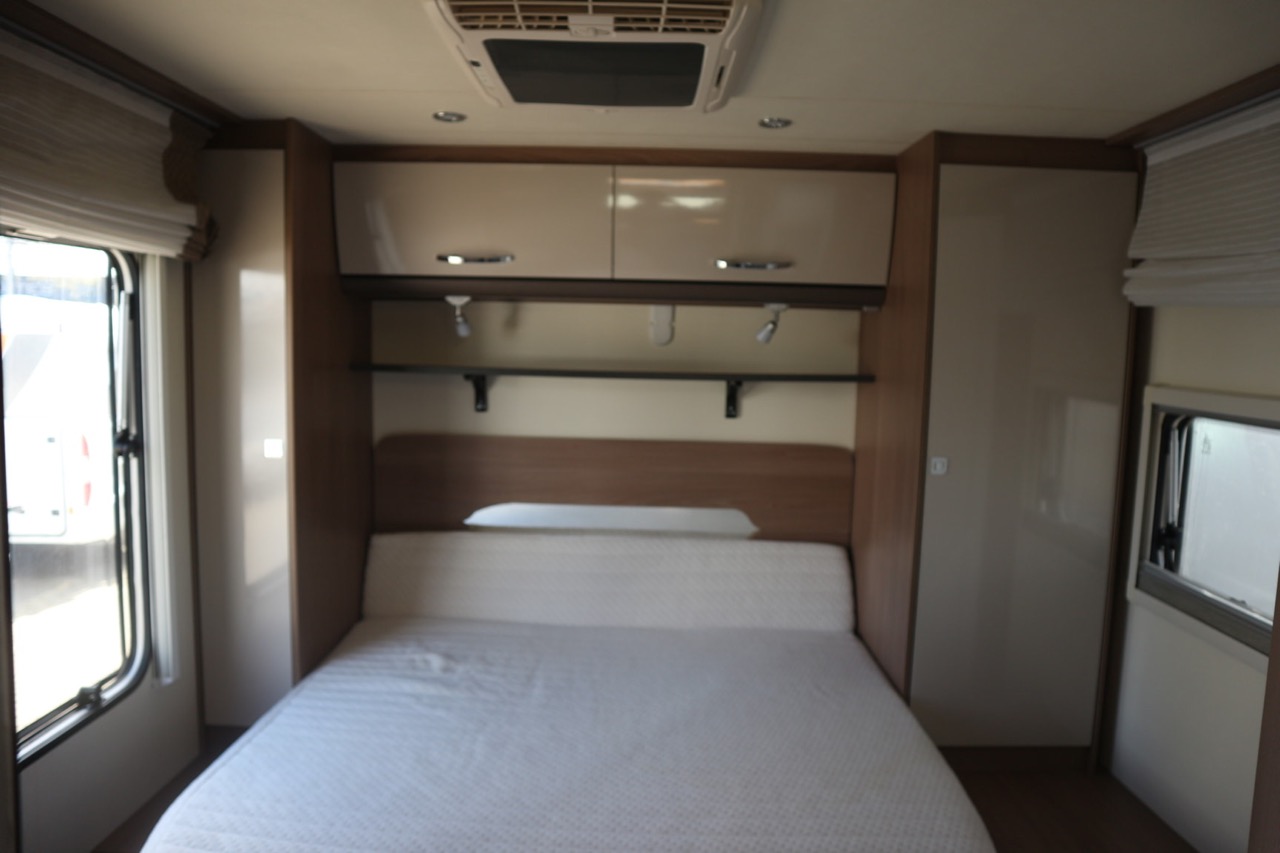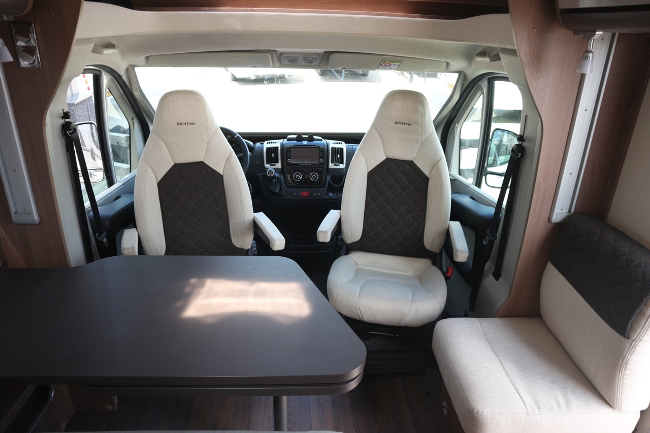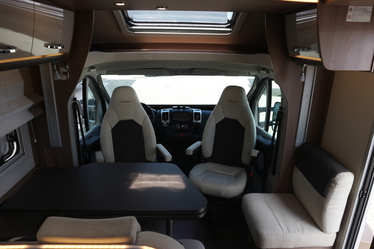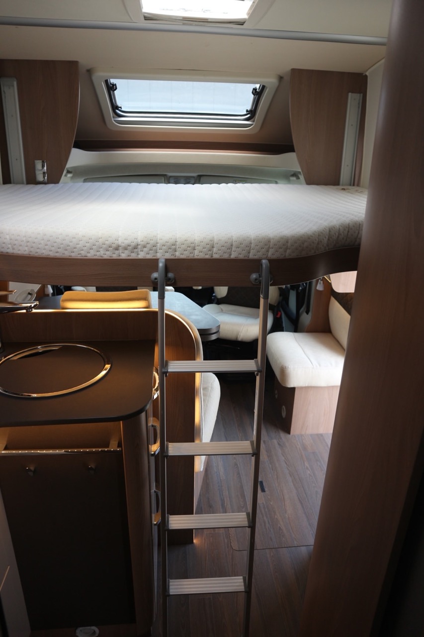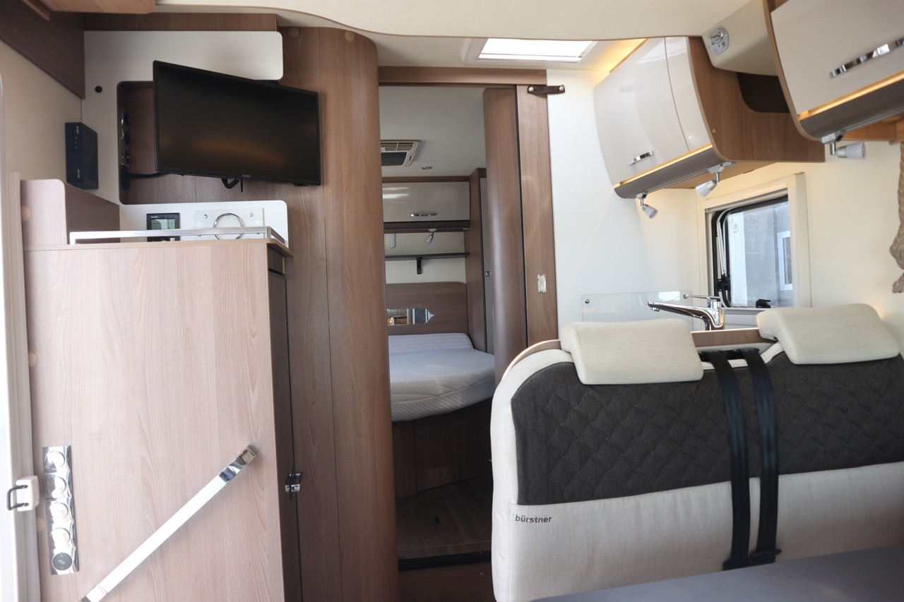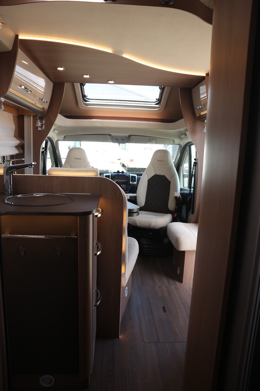 Een prima gelegenheid om gezellig te eten of nieuwe plannen te maken wordt gevormd door de halve treinzit. De keuken is in het midden van de camper gemonteerd en beschikt onder meer over een 3-pits kooktoestel en gootsteen met kraan. De boiler, die in de camper is ingebouwd, voorziet u snel van warm water. De koelkast met vriesvak biedt voldoende ruimte voor heel uw voorraad.